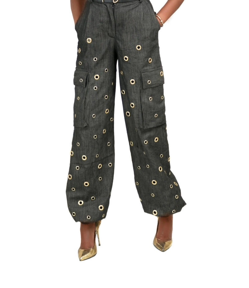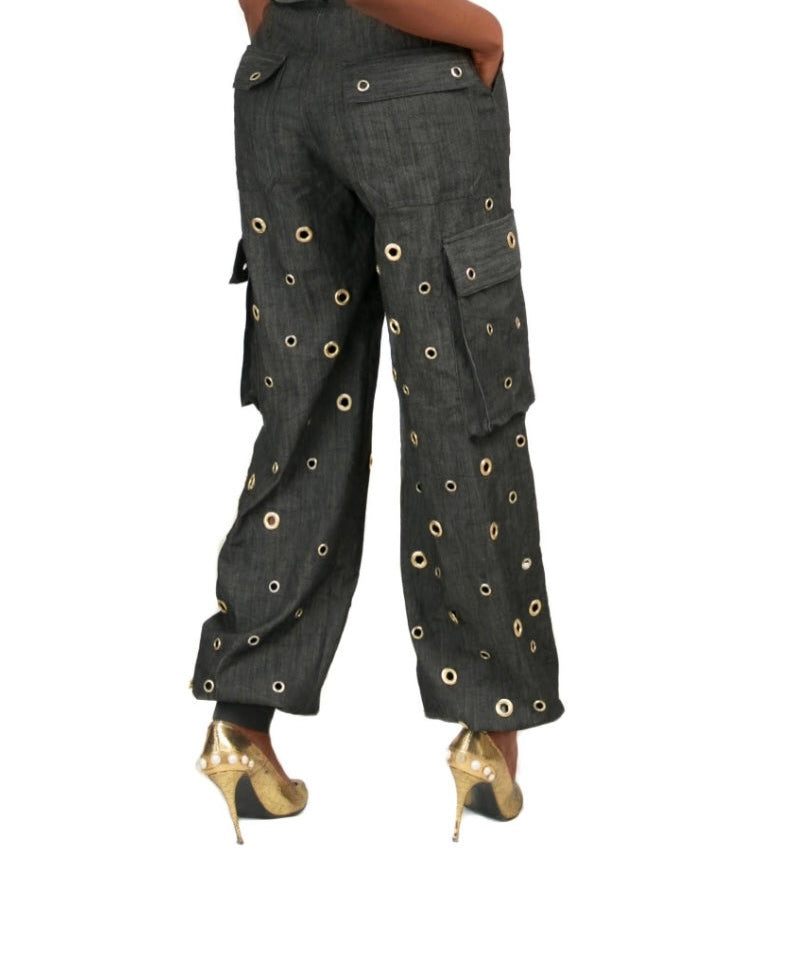 Timeless six-pocket harem-style high-waist cargo pants hand-made from denim with individually placed gold grommets and zip fastening.
