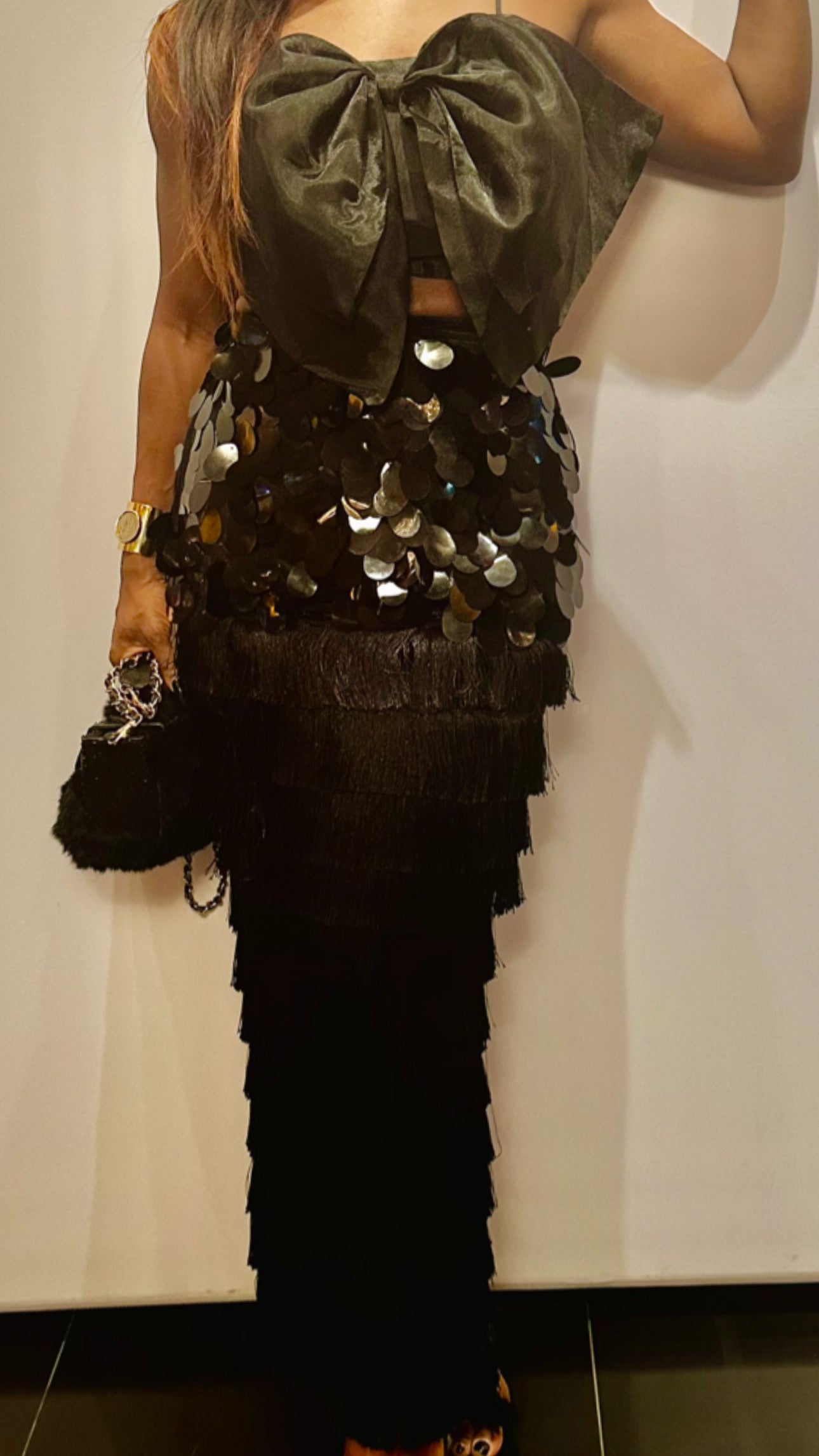 Handmade with jumbo sequins and multi-tier fringe meticulously layered over luxurious velvet, the Henrietta Skirt is elegance with a touch of playfulness. With its striking shine and captivating movement, this piece transitions seamlessly from the red carpet to any occasion, adapting effortlessly with your choice of top and accessories. A showstopper on its own, the Henrietta Skirt lets you redefine each look, radiating glamour with every step.